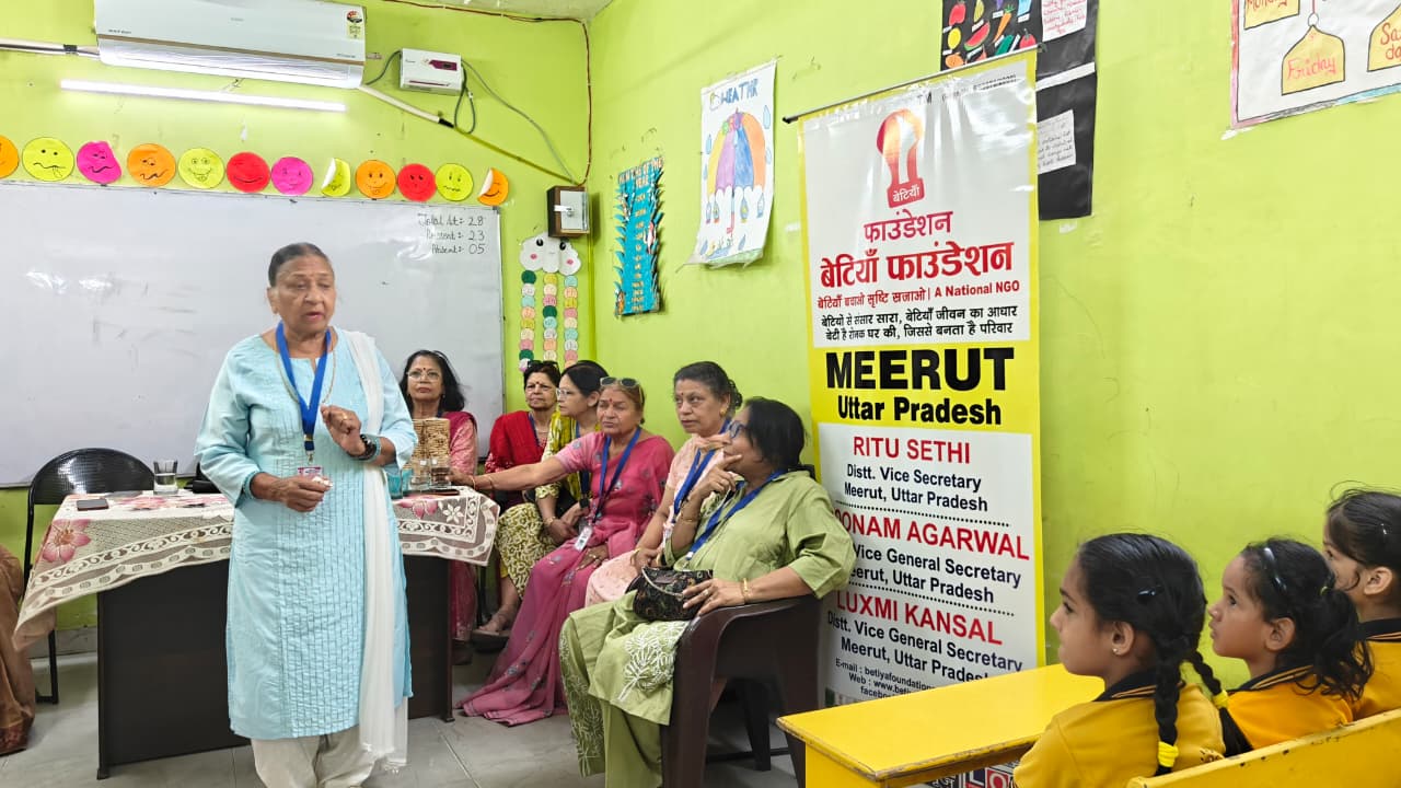 डा ज्योत्सना जैन जी के द्वारा संस्थापित ” बेटियां फाउंडेशन “ की मेरठ टीम के द्वारा एक बहुत सुन्दर और प्रेरणादायक कार्यशाला आज दिनांक 24-4-26 को सदर बाजार स्थित ” लिटिल माइण्ड स्कूल” में सफलता पूर्वक सम्पन्न की गयी। इसमें कक्षा 1 से कक्षा 4 तक के बच्चों को “अच्छा स्पर्श और बुरे स्पर्श ” के बारे में पूनम अग्रवाल जी के द्वारा प्रेरणादायक कहानी के माध्यम से विस्तार से समझाया गया। उन्होने बच्चों को सतर्क रहते हुए खुद के विवेक के अनुसार व्यवहार करने की सलाह दी।